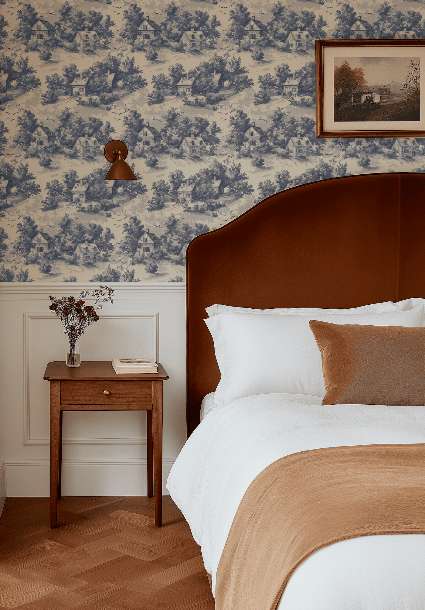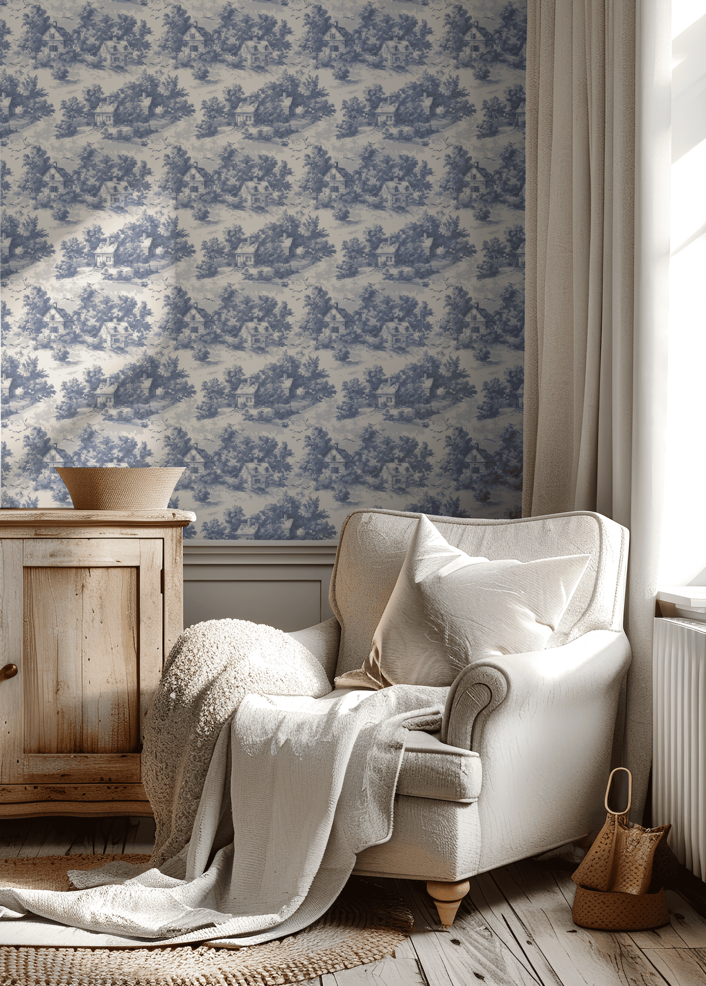 Tapeta Granatowa Wieś w Stylu Vintage przenosi do urokliwego krajobrazu wiejskiego, ukazując malownicze domki i drzewa na głębokim granatowym tle. Jej kremowe akcenty dodają elegancji i rozjaśniają przestrzeń, co sprawia, że tapeta idealnie nadaje się do sypialni, przedpokoju, jadalni oraz kuchni. Wnosi do wnętrza atmosferę spokoju i nostalgii, nawiązując do tradycyjnych wartości.
