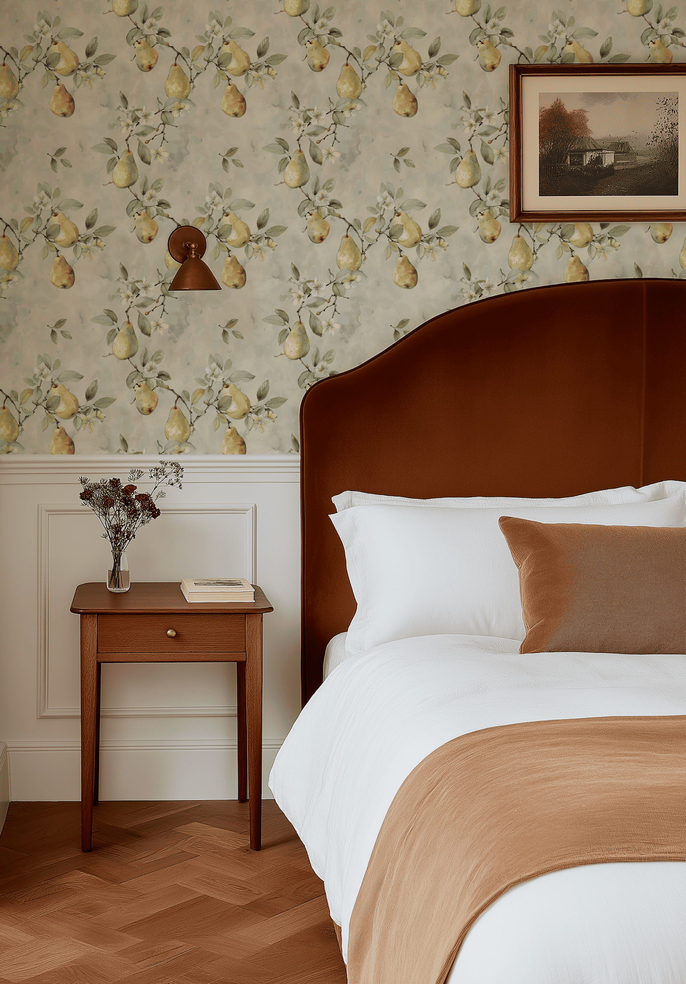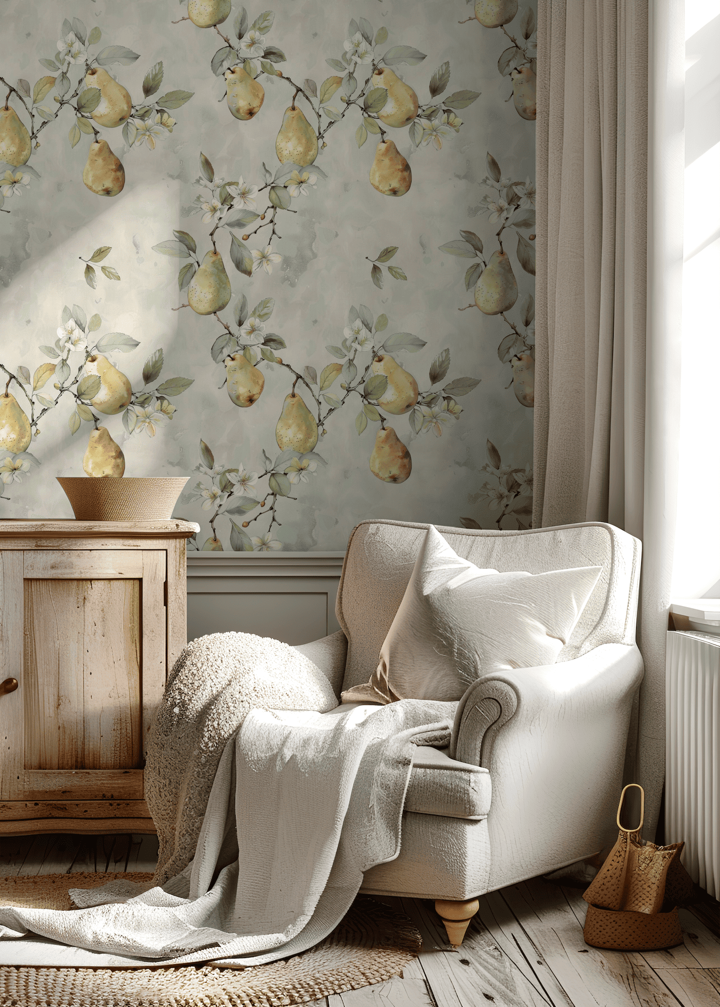 Dodaj do swojego wnętrza nutę natury z tapetą „Gruszkowy Sad” i ciesz się ponadczasowym pięknem owocowych motywów.