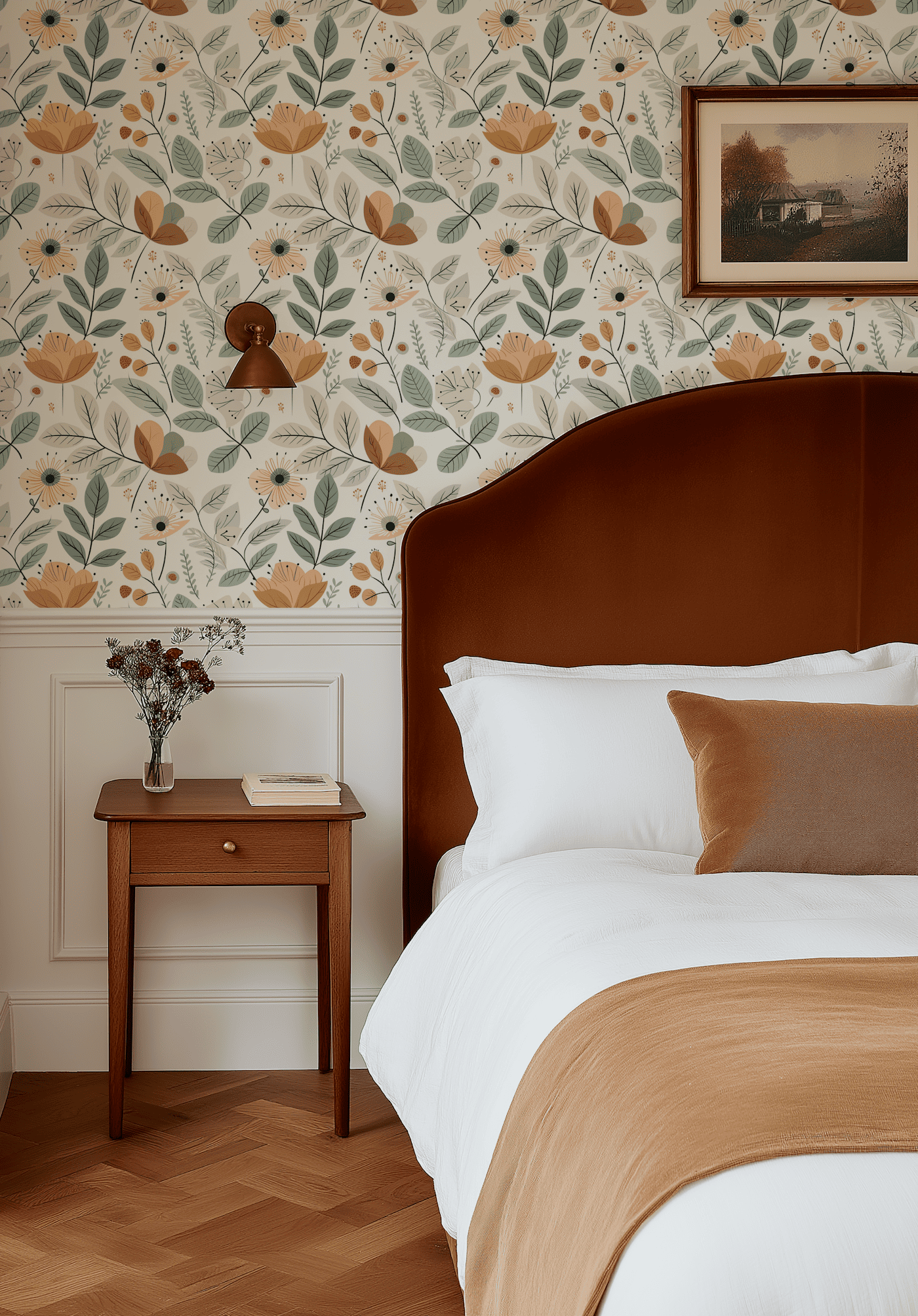 Tapeta Pastelowe Marzenia Kwiatów to doskonały wybór dla miłośników minimalistycznego designu i subtelnych akcentów florystycznych. Jej kompozycja pastelowych kwiatów i liści w odcieniach zieleni, pomarańczu oraz kremu wprowadza do wnętrza świeżość i lekkość, idealnie pasując do sypialni, przedpokoju, jadalni, kuchni oraz pokoju dziewczynki.