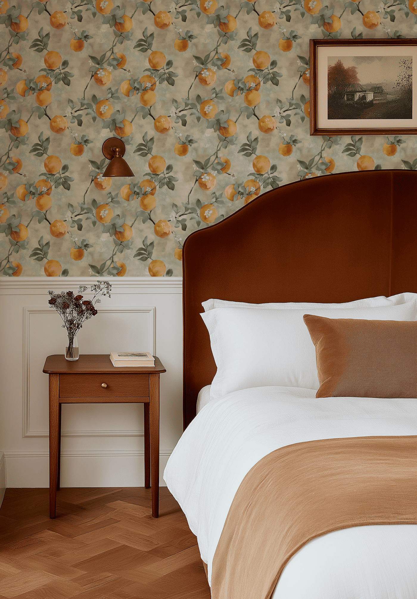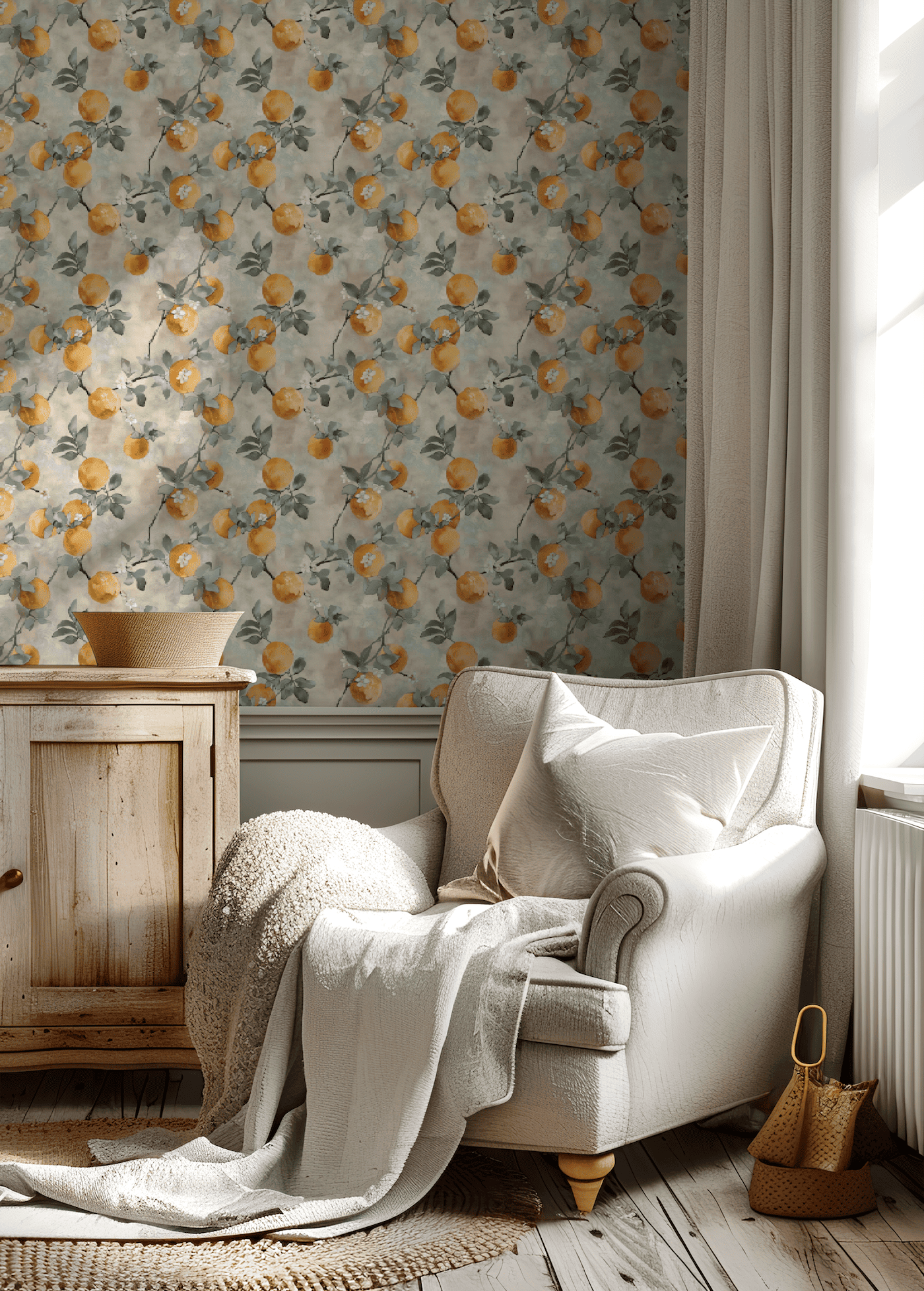Wprowadź odrobinę owocowej świeżości do swojego domu i ciesz się wyjątkowym stylem, który oferuje tapeta Pomarańczowy Ogród.