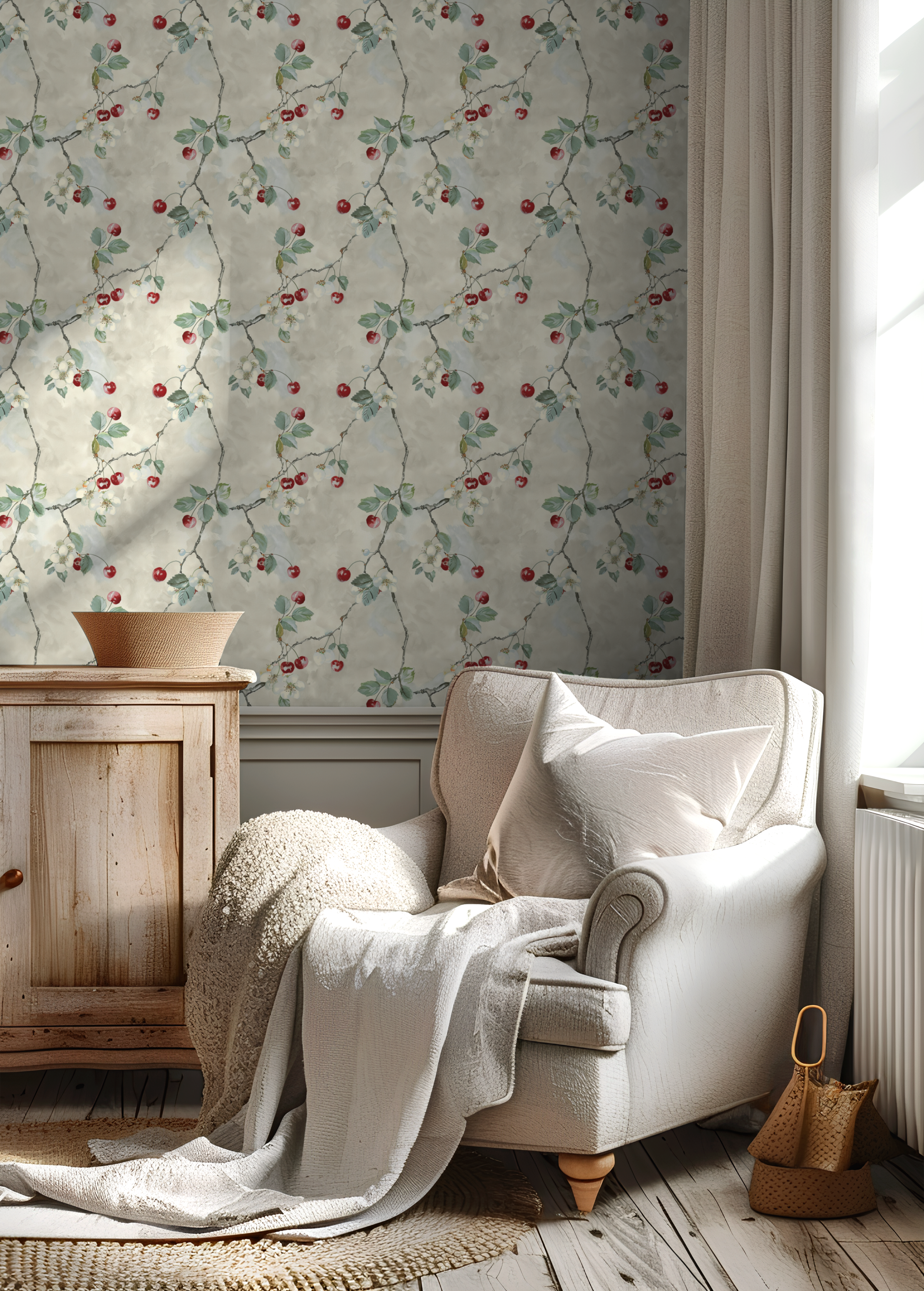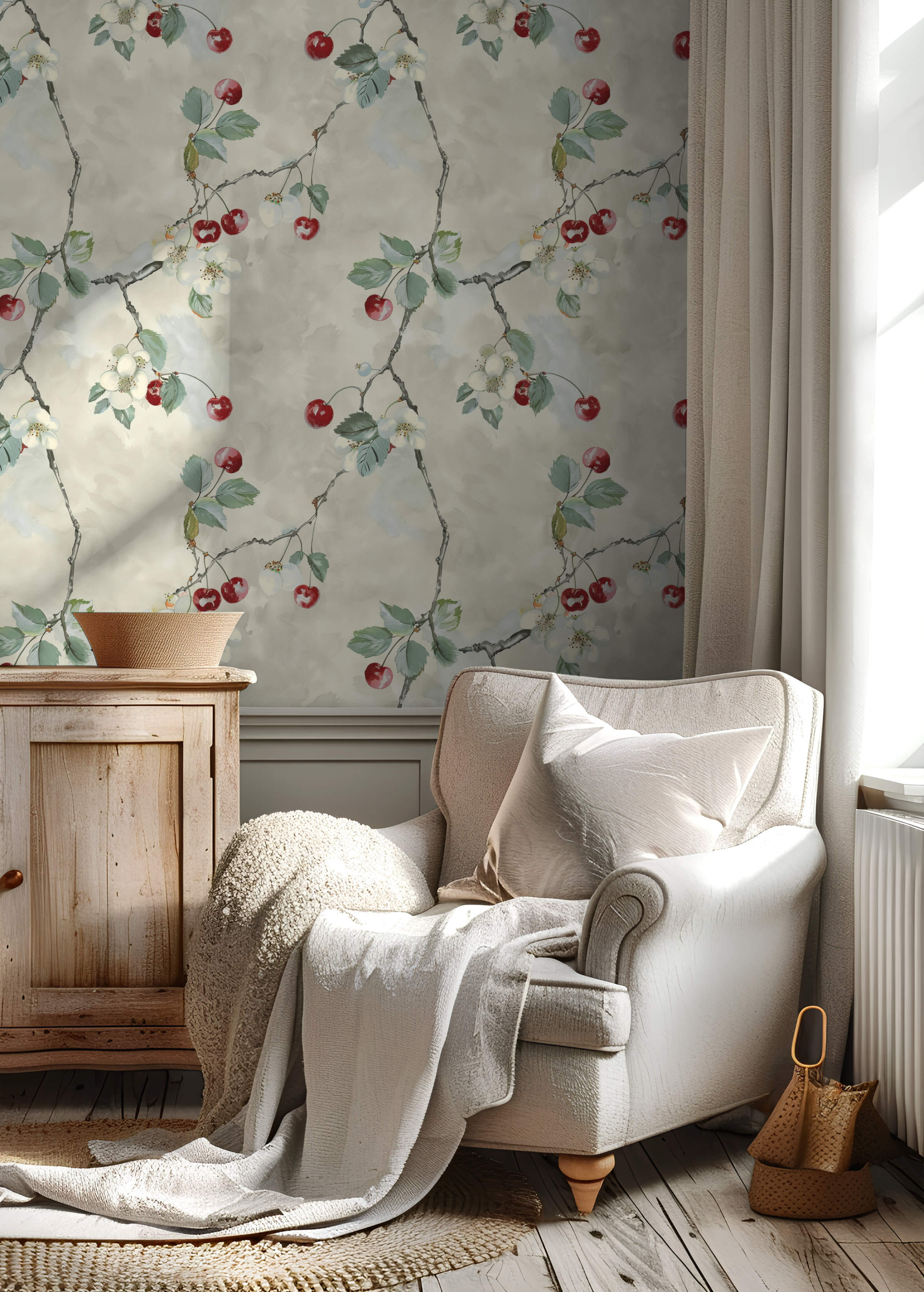 Tapeta Wiśniowy Sad to piękna dekoracja, która wprowadza do wnętrza świeżość i naturalny urok. Motyw gałązek z soczystymi wiśniami, osadzony na tle delikatnej zieleni, tworzy harmonijną i przyjemną atmosferę. Kolorystyka tapety, łącząca odcienie czerwieni i bieli, doskonale wpisuje się w tradycyjne aranżacje, nadając im ciepła i przytulności.