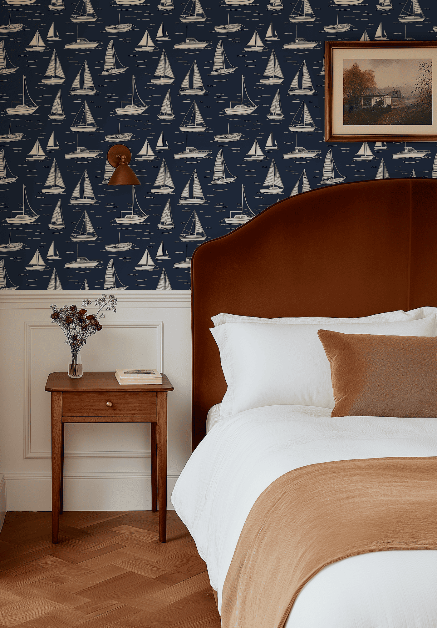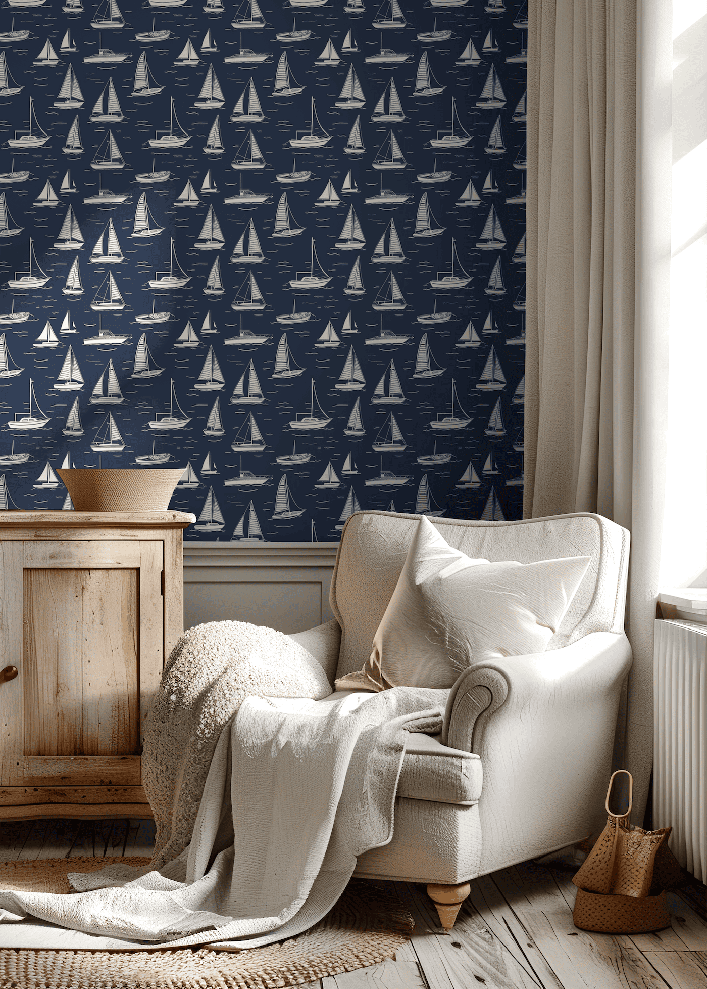 Tapeta Żeglarska Przygoda to doskonały wybór dla miłośników stylu marynistycznego, którzy pragną wprowadzić do swojego wnętrza klimat nadmorskiej przygody. Na głębokim granatowym tle pięknie prezentują się białe żaglówki, które dodają lekkości i świeżości przestrzeni. Ta stylowa tapeta sprawdzi się w wielu pomieszczeniach, takich jak sypialnia, przedpokój, jadalnia, kuchnia, biuro, hol, a także pokój dziecięcy, tworząc wyjątkową atmosferę.